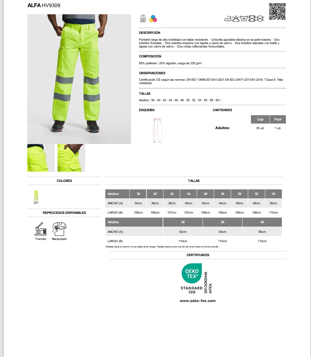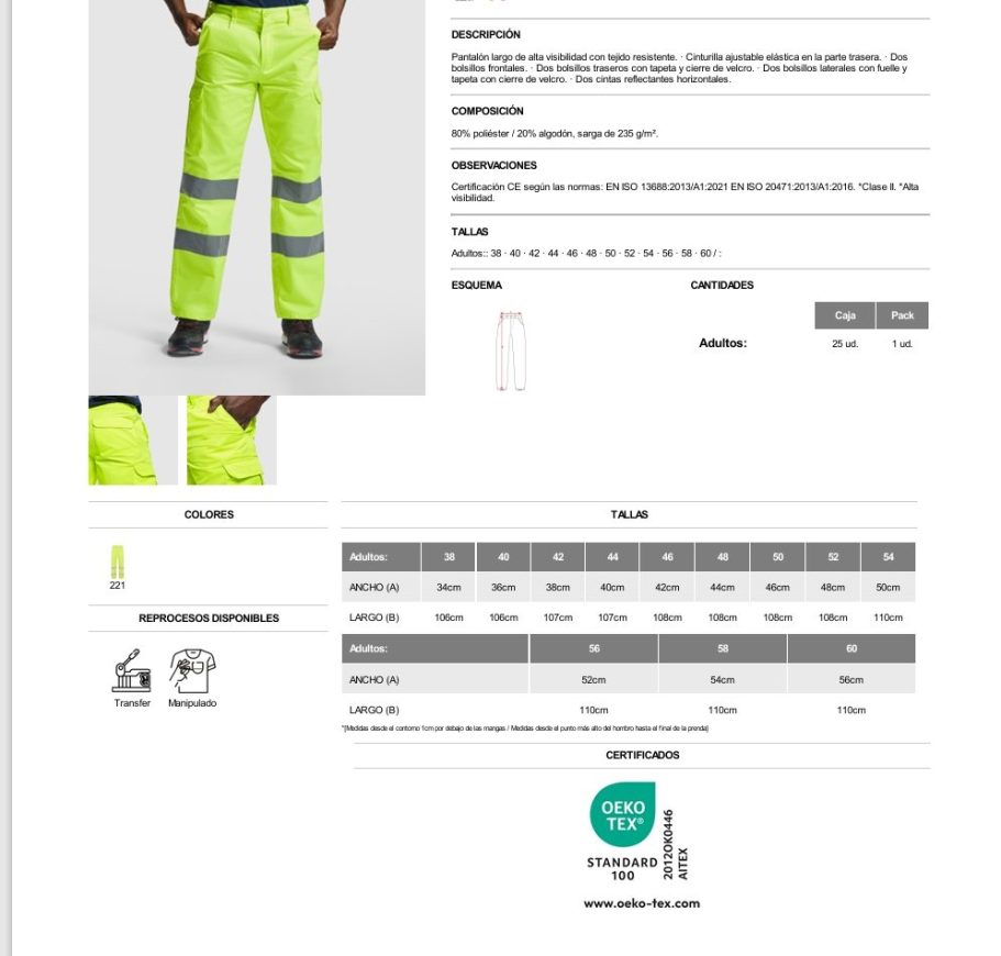 Certificación CE según las normas: EN ISO 13688:2013/A1:2021 EN ISO 20471:2013/A1:2016. *Clase II.