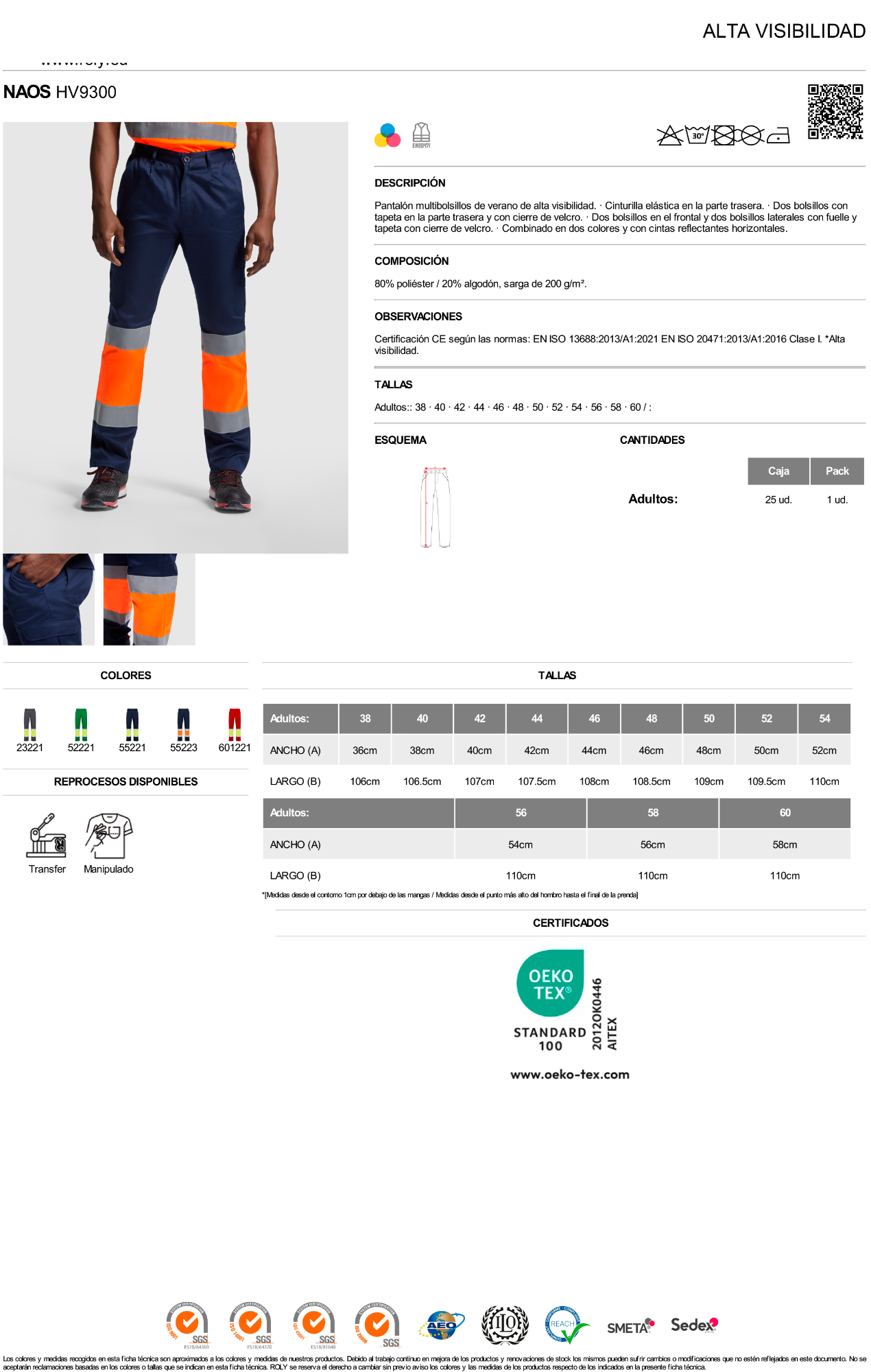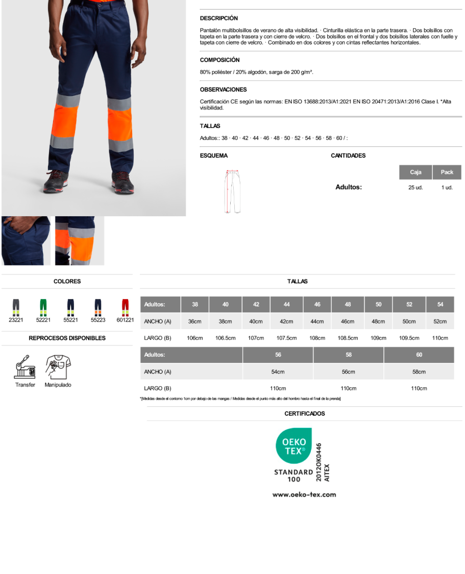 Certificación CE según las normas: EN ISO 13688:2013/A1:2021 EN ISO 20471:2013/A1:2016 Clase I. *Alta visibilidad.