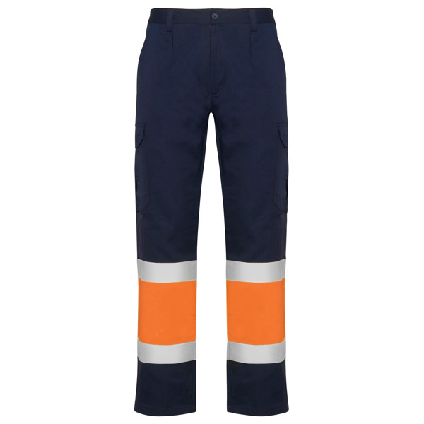 Pantalón multibolsillos de verano de alta visibilidad. · Cinturilla elástica en la parte trasera. · Dos bolsillos con tapeta en la parte trasera y con cierre de velcro. · Dos bolsillos en el frontal y dos bolsillos laterales con fuelle y tapeta con cierre de velcro. · Combinado en dos colores y con cintas reflectantes horizontales.