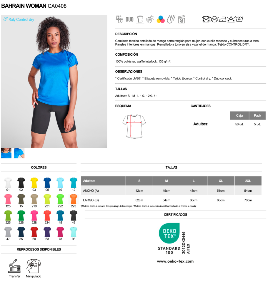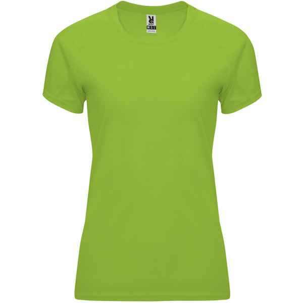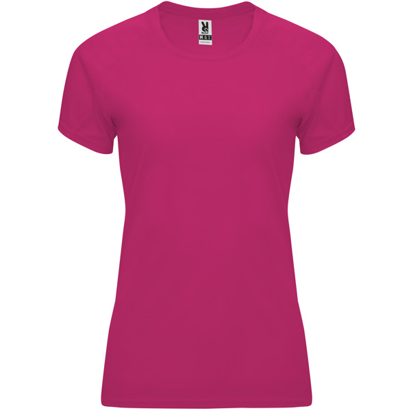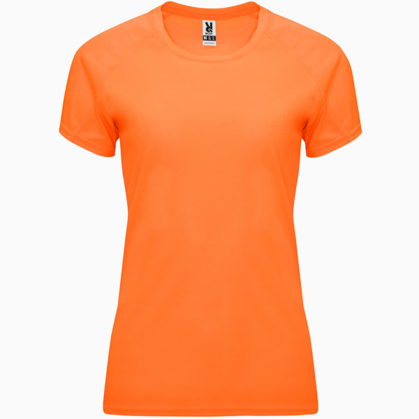 Camiseta técnica entallada de manga corta ranglán para mujer, con cuello redondo y cubrecosturas a tono. Paneles inferiores en mangas. Remallado a tono en sisa y panel de manga. Tejido CONTROL DRY.