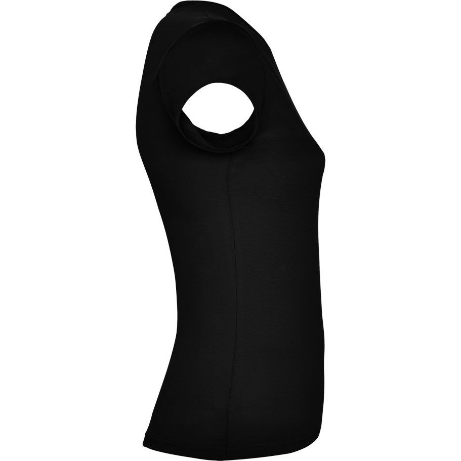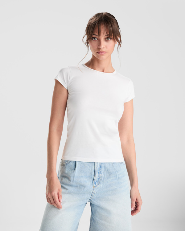 Camiseta de manga corta con cuello fino ribeteado. Tejido de fácil lavado y secado, muy confortable. Corte entallado con costuras laterales.