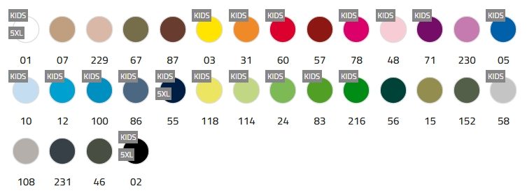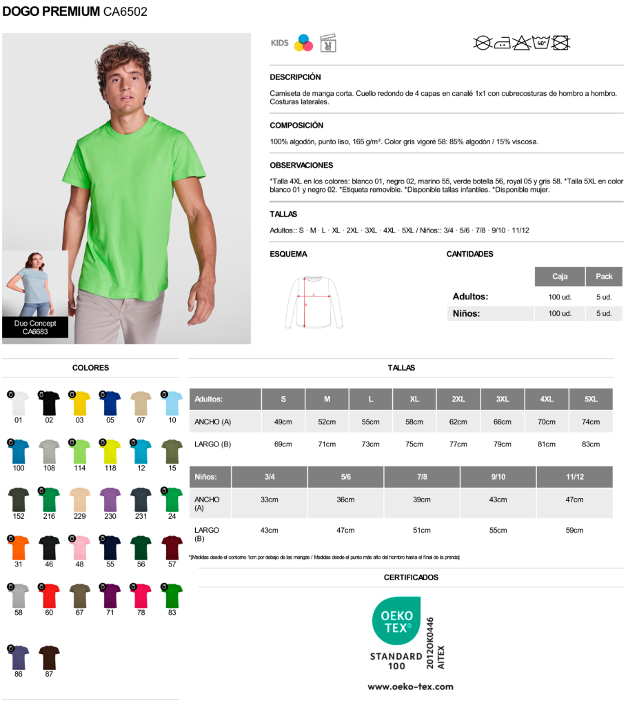 Material: 100% algodón, punto liso, 165 g/m². Color gris vigoré 58: 85% algodón / 15% viscosa.