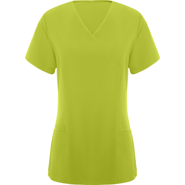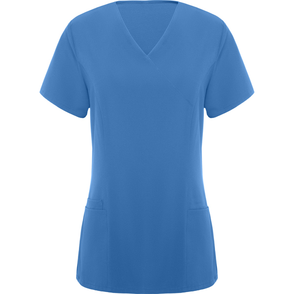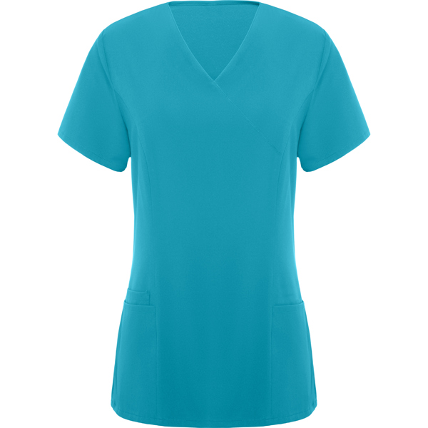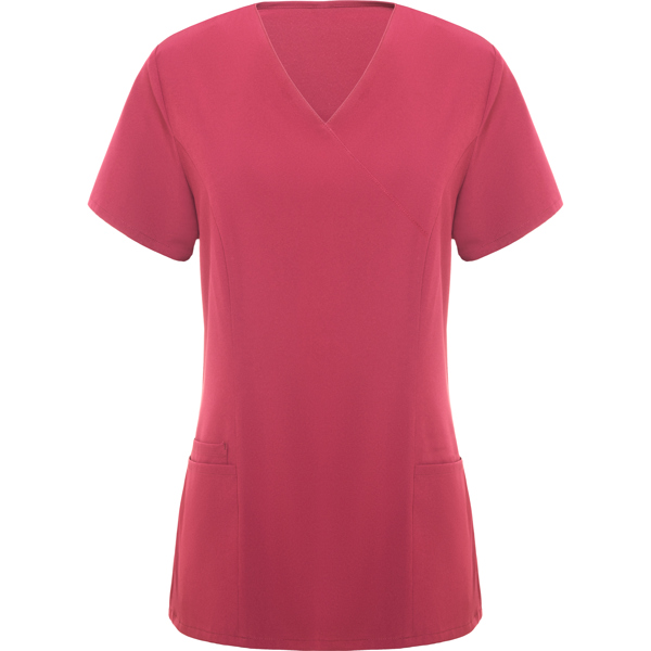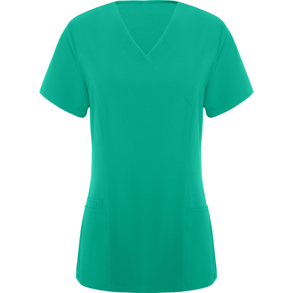 Casaca de servicios de manga corta de mujer. · Escote de pico cruzado. · Dos bolsillos franceses. · Aperturas laterales.