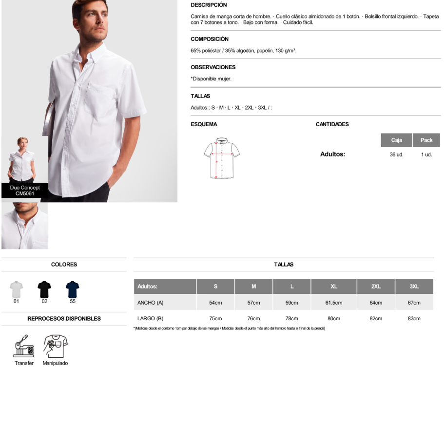 Camisa de manga corta de hombre. · Cuello clásico almidonado de 1 botón. · Bolsillo frontal izquierdo. · Tapeta con 7 botones a tono. · Bajo con forma. · Cuidado fácil.