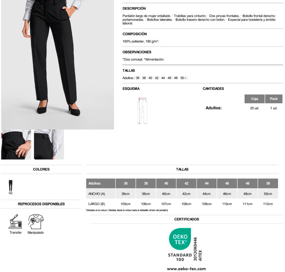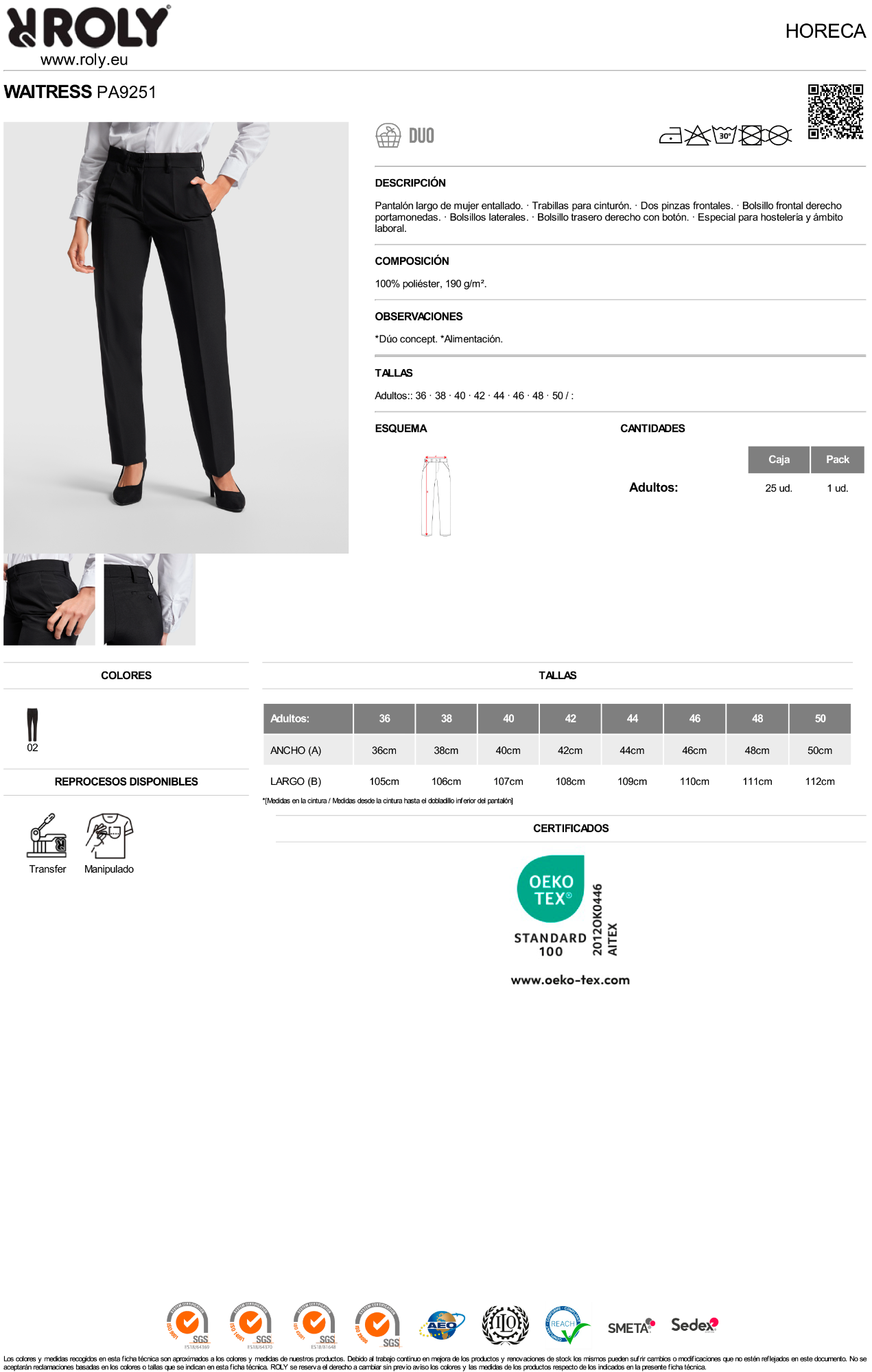 Pantalón largo de mujer entallado. · Trabillas para cinturón. · Dos pinzas frontales. · Bolsillo frontal derecho portamonedas. · Bolsillos laterales. · Bolsillo trasero derecho con botón. · Especial para hostelería y ámbito laboral.