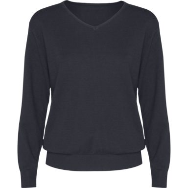 Jersey de mujer con escote de pico en punto fino. Acabado en punto de canalé 1x1 al tono en escote, puños y bajo.