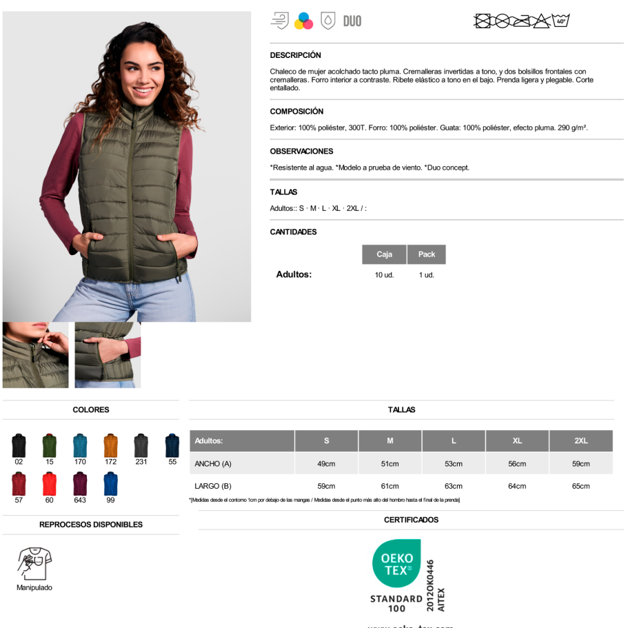 Material: Exterior: 100% poliéster, 300T. Forro: 100% poliéster. Guata: 100% poliéster, efecto pluma. 290 g/m².