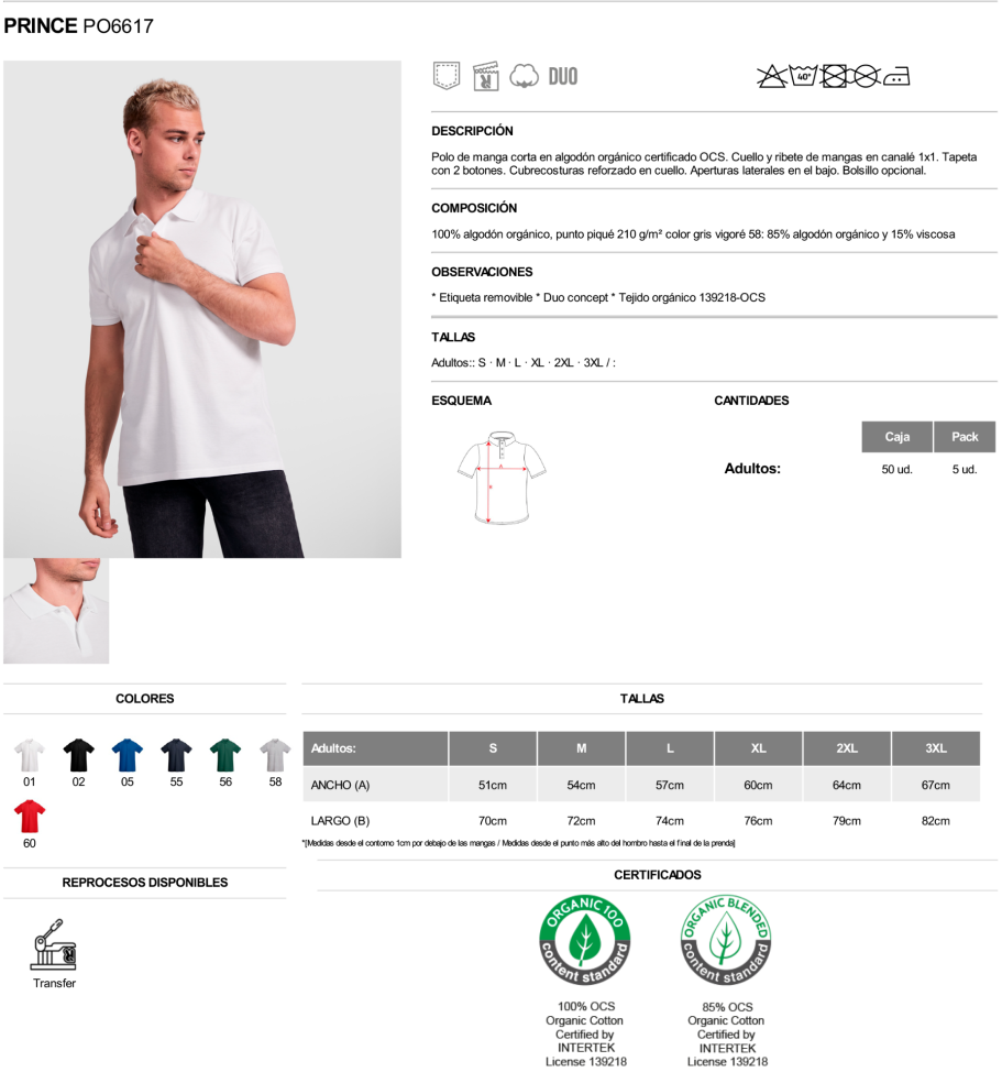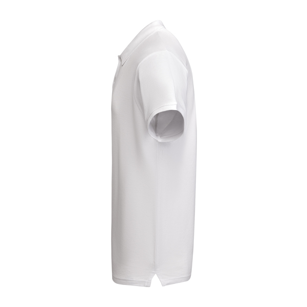Polo de manga corta en algodón orgánico certificado OCS. Cuello y ribete de mangas en canalé 1x1. Tapeta con 2 botones. Cubrecosturas reforzado en cuello. Aperturas laterales en el bajo. Bolsillo opcional.