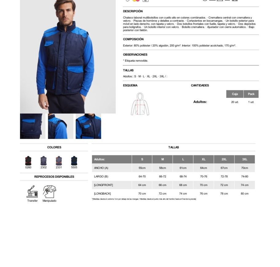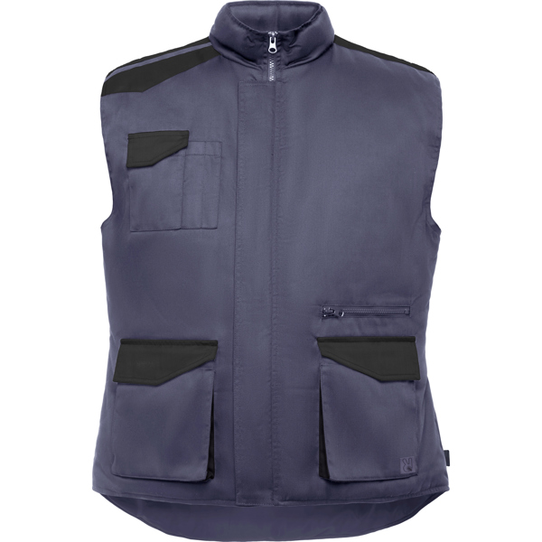 Chaleco laboral multibolsillos con cuello alto en colores combinados. · Cremallera central con cremallera y velcro. · Piezas de hombros y detalles a contraste. · Cortavientos en bocamangas. · Un bolsillo exterior para móvil en lado derecho, con tapeta y velcro. · Dos bolsillos frontales con fuelle, tapeta y velcro. · Dos depósitos para bolígrafos. · Un bolsillo interior con velcro. · Bolsillo cremallera. · Ajustador con cierre automático. · Bajo posterior con faldón.