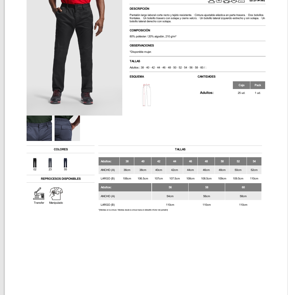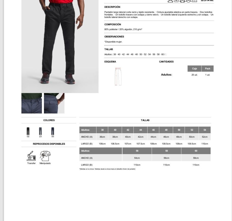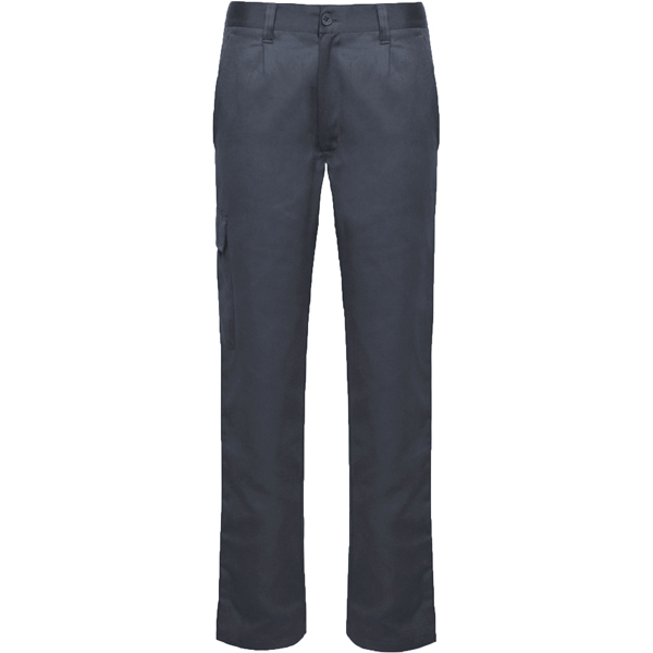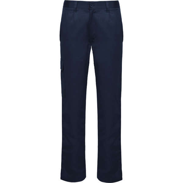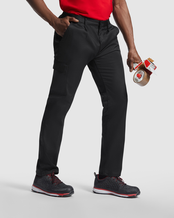 Pantalón largo laboral corte recto y tejido resistente. · Cintura ajustable elástica en parte trasera. · Dos bolsillos frontales. · Un bolsillo trasero con solapa y cierre velcro. · Un bolsillo lateral izquierdo estrecho y sin solapa. · Un bolsillo lateral derecho con solapa.