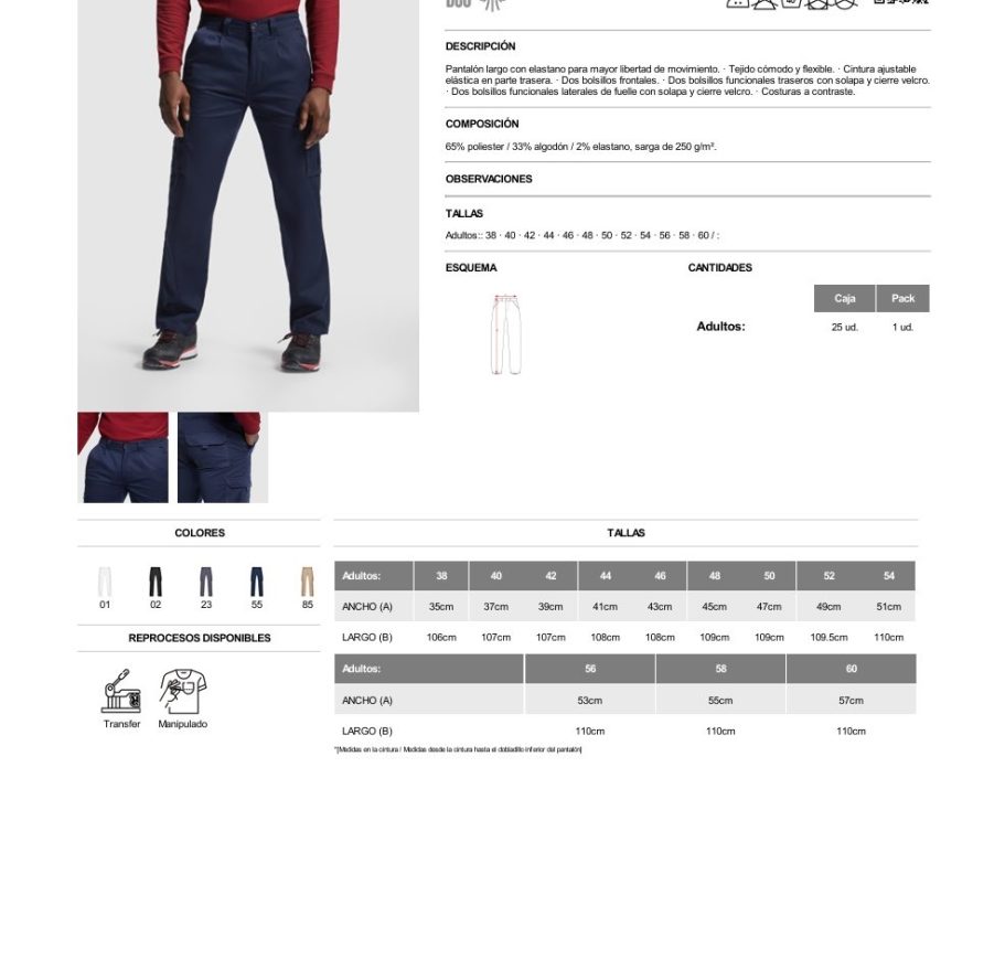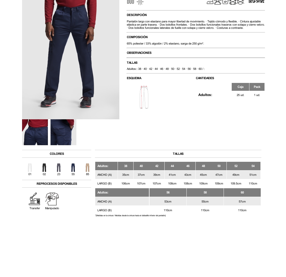Material: 65% poliester / 33% algodón / 2% elastano, sarga de 250 g/m².