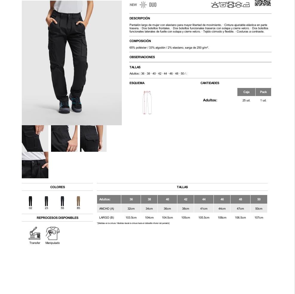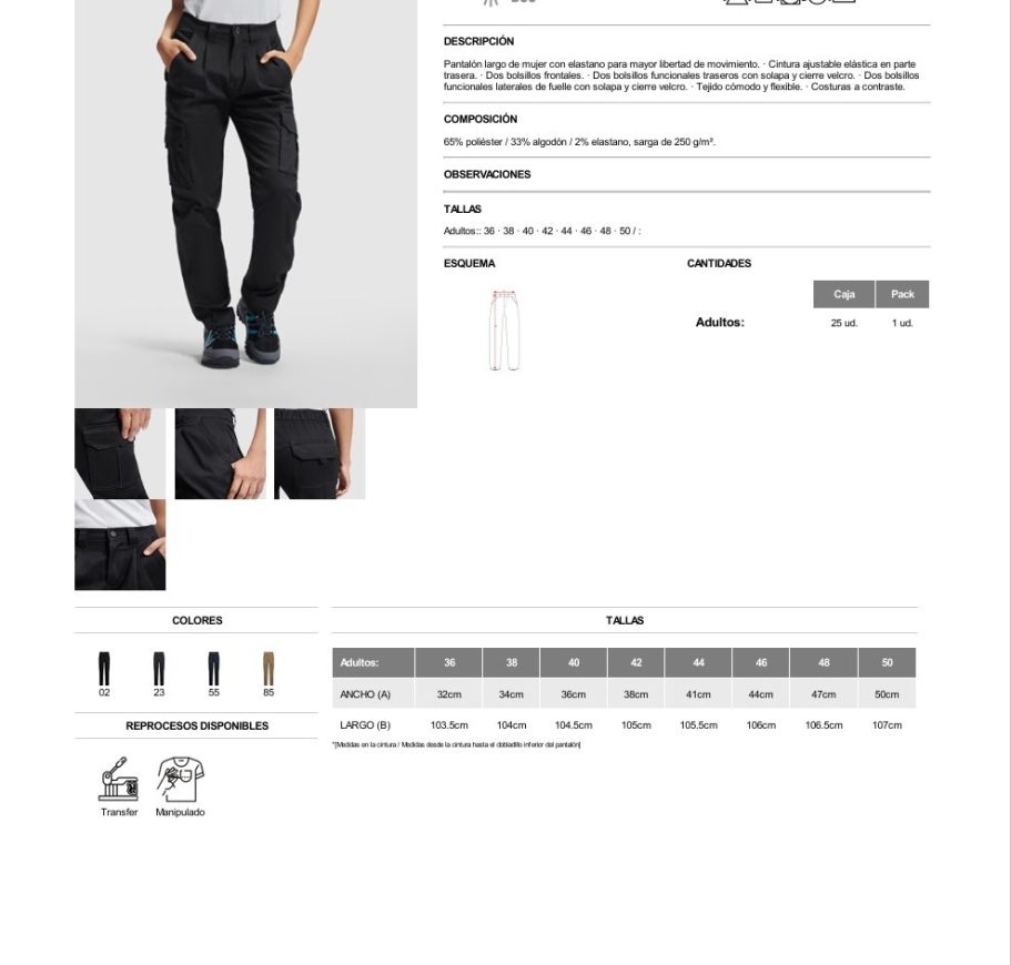 Material: 65% poliéster / 33% algodón / 2% elastano, sarga de 250 g/m².