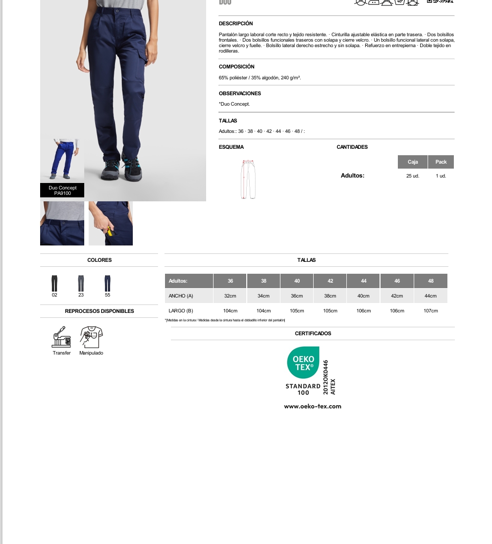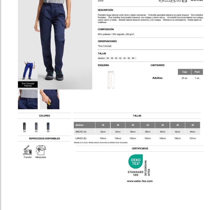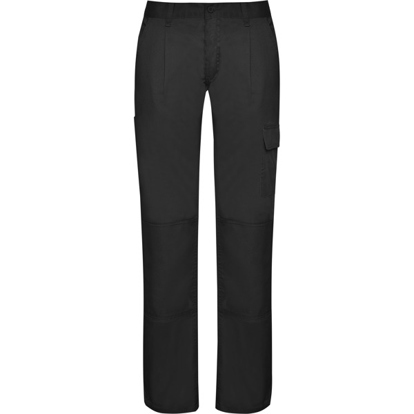 Pantalón largo laboral corte recto y tejido resistente. · Cinturilla ajustable elástica en parte trasera. · Dos bolsillos frontales. · Dos bolsillos funcionales traseros con solapa y cierre velcro. · Un bolsillo funcional lateral con solapa, cierre velcro y fuelle. · Bolsillo lateral derecho estrecho y sin solapa. · Refuerzo en entrepierna · Doble tejido en rodilleras.