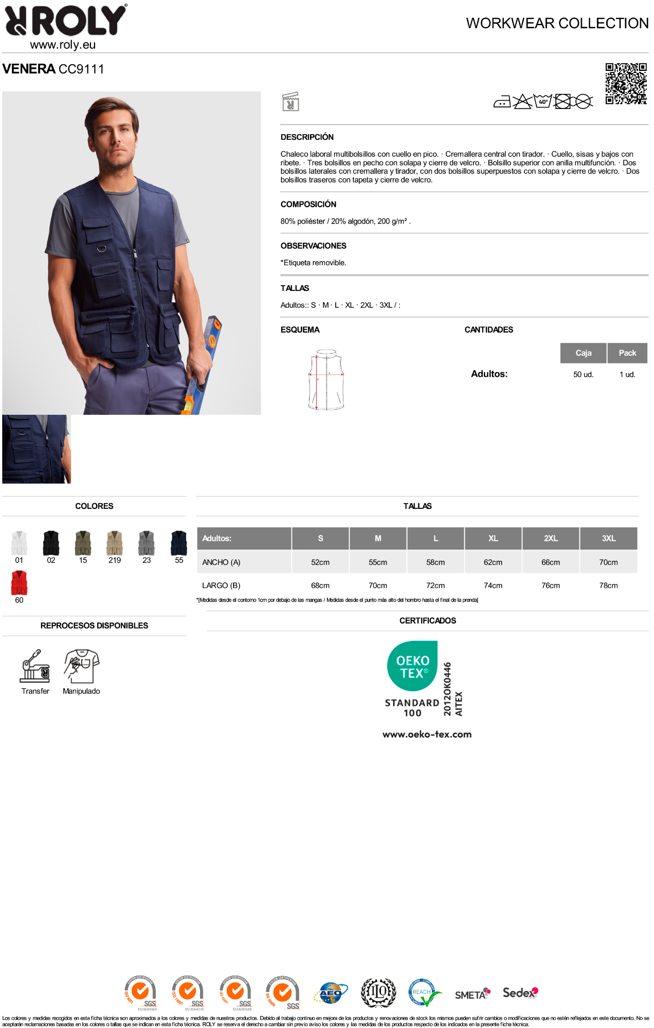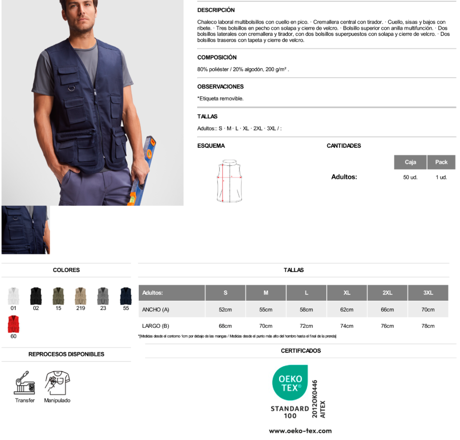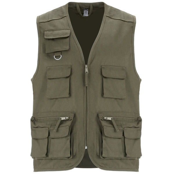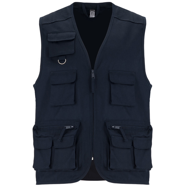 Chaleco laboral multibolsillos con cuello en pico. · Cremallera central con tirador. · Cuello, sisas y bajos con ribete. · Tres bolsillos en pecho con solapa y cierre de velcro. · Bolsillo superior con anilla multifunción. · Dos bolsillos laterales con cremallera y tirador, con dos bolsillos superpuestos con solapa y cierre de velcro. · Dos bolsillos traseros con tapeta y cierre de velcro.