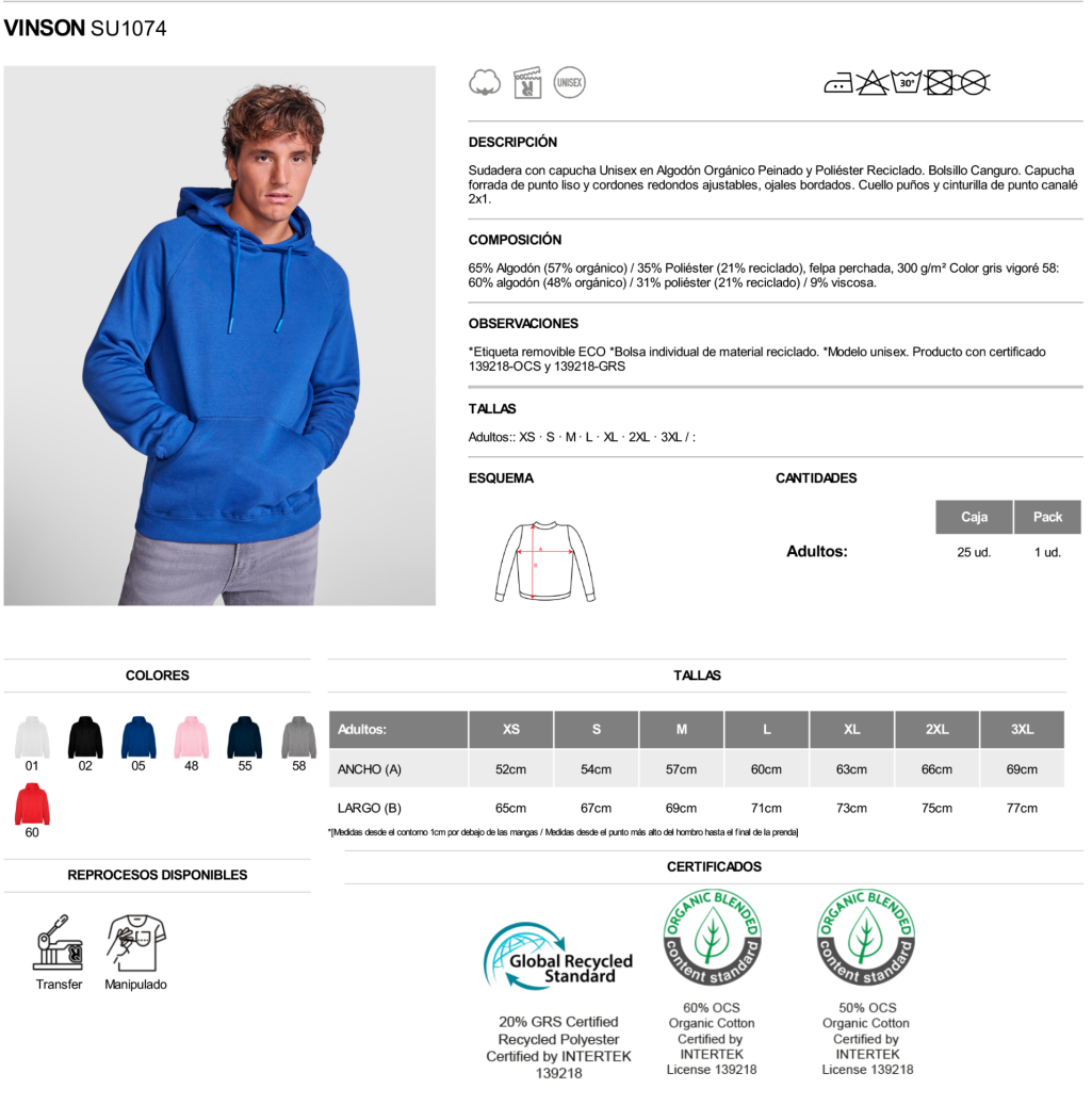 Material: 65% Algodón (57% orgánico) / 35% Poliéster (21% reciclado), felpa perchada, 300 g/m² Color gris vigoré 58: 60% algodón (48% orgánico) / 31% poliéster (21% reciclado) / 9% viscosa.