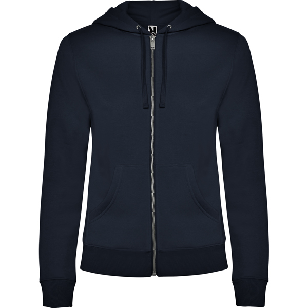 Sudadera de mujer con capucha forrada a tono. Cremallera metálica frontal y bolsillo estilo canguro. Cubrecosturas reforzado en el cuello interior, corte entallado, y punto canalé 2x2 en puños y cintura.