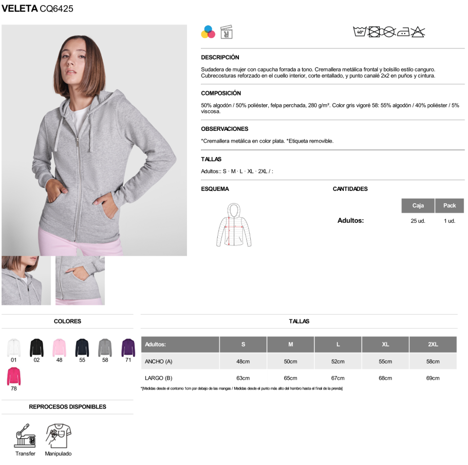 Material: 50% algodón / 50% poliéster, felpa perchada, 280 g/m². Color gris vigoré 58: 55% algodón / 40% poliéster / 5% viscosa.